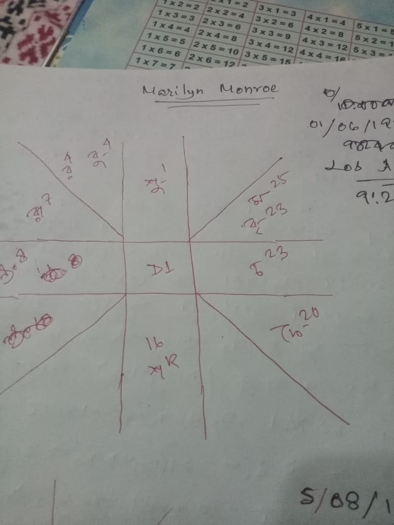 ০৫/০৮/১৯৬২ সালে জাতচক্রে বৃহস্পতির অবস্থান সেই ৮ম ভাবে এসেছিলো। সব দিক থেকেই ৮ম ভাবকে জাগ্রত করেছিলো। বৃহস্পতি+মঙ্গল+মঙ্গলের দশায় মেরেলিনের মৃত্যু হয়েছিলো। ওই দুটি গ্রহের অবস্থান জন্ম কালীন ৮ম ভাবেই ছিলো।